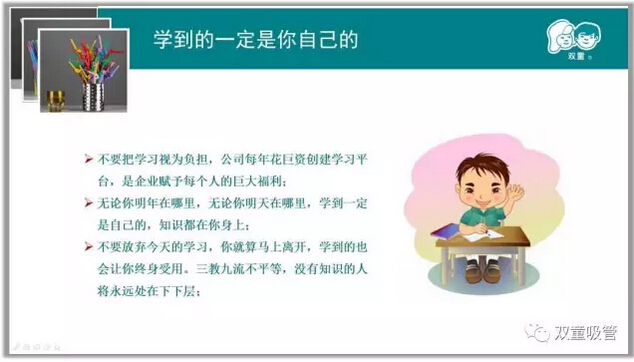 學(xué)歷≠知識、才人≠人才,學(xué)習(xí)并不是學(xué)校里才需要做的事!如果工作以后就不思進(jìn)取,不學(xué)習(xí)提升,就算是博士生,“雙童”也不會對你敞開大門!而對于那些肯學(xué)習(xí)、肯鉆研的員工,“雙童”會提供非常多的學(xué)習(xí)機(jī)會和提升空間,讓你在“雙童”有一個更好的發(fā)展!就算有一天你離開了“雙童”,你學(xué)到的始終是你自己的!