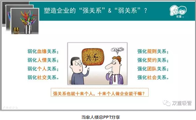 所以,我們要弱化血緣關(guān)系,強(qiáng)化規(guī)則關(guān)系:在“雙童”,雖然有非常多的小家庭,但我們制定了親屬回避制度,以規(guī)則來制定關(guān)系;弱化人情關(guān)系,強(qiáng)化契約關(guān)系;弱化個(gè)人關(guān)系,強(qiáng)化團(tuán)隊(duì)關(guān)系;弱化社交關(guān)系,強(qiáng)化社會(huì)關(guān)系:不要依賴管理者個(gè)人的交際關(guān)系,轉(zhuǎn)而形成以團(tuán)隊(duì)和企業(yè)組織、與政府、與媒體和相關(guān)組織形成的良性關(guān)系,從而弱化個(gè)人關(guān)系,強(qiáng)化組織關(guān)系!