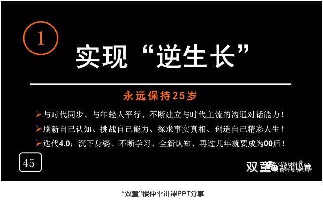 實現(xiàn)“逆生長”:“雙童”樓仲平通過不斷的到各地演講寫課件鍛煉自己,嘗試新的突破,喜歡挑戰(zhàn)新的東西,永遠(yuǎn)將自己定位在25歲,不斷學(xué)習(xí)去認(rèn)知新的世界,去擁抱這個高速變化的世界,從而影響團(tuán)隊并保持“雙童”不被淘汰。最后,樓總也鼓勵所有在座的創(chuàng)業(yè)者不能老去,要與時代保持同步,接受不斷變化和挑戰(zhàn),迎合這個高度變化的世界!