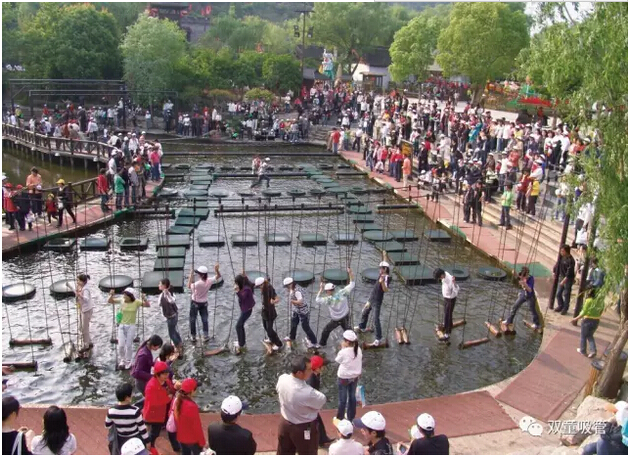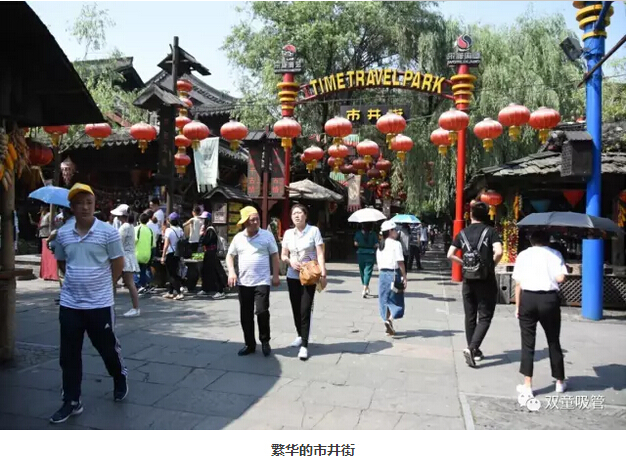走進(jìn)景區(qū)內(nèi),一派市井熱鬧的景象!街衢縱橫,茶樓酒肆、藝場(chǎng)教坊林立,處處管弦笙歌。傳統(tǒng)賣(mài)藝耍大刀的當(dāng)街而舞、皮影戲、曲藝、 “繡球招親”、鬼屋,各類(lèi)項(xiàng)目真是應(yīng)接不暇,“雙童”人都要high翻天啦!