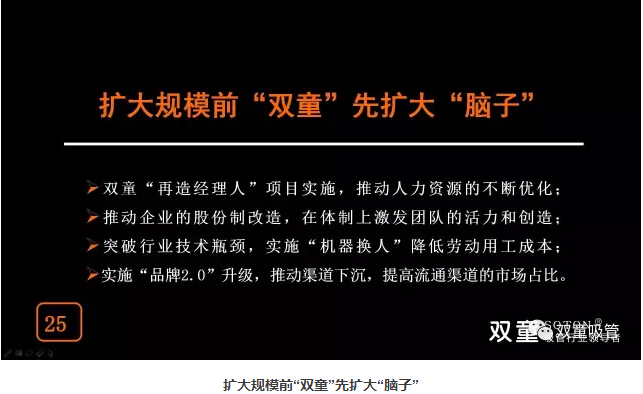 未來十年,“雙童”將繼續(xù)轉(zhuǎn)變商業(yè)模式,在規(guī)模上保持適量擴(kuò)張,實(shí)施機(jī)器換人提高產(chǎn)出效率,重塑流通渠道,提高市場(chǎng)占比!“適當(dāng)?shù)囊?guī)模”未必跟硬資產(chǎn)規(guī)模、產(chǎn)值、員工數(shù)成正比,不同行業(yè)對(duì)企業(yè)“適當(dāng)?shù)囊?guī)模”應(yīng)該有不同的認(rèn)知和判斷,根據(jù)企業(yè)經(jīng)營(yíng)“時(shí)間軸”變化做相應(yīng)調(diào)整來改變“雙童”未來在行業(yè)當(dāng)中的地位!