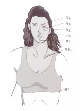 5. 依次敲擊下圖的7個部位加上頭頂(眉頭、眼側(cè)、眼底、人中、嘴下、鎖骨尖、腋下、頭頂),同時大聲地說出“壓力王”事件給你帶來的痛苦,每個部位敲擊5-7次。