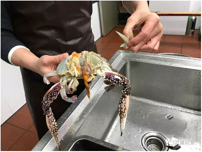 12、取出砂囊后將蟹身兩側(cè)的蟹鰓(看上去像魚(yú)鰓)用手工拔除干凈,如果蟹鰓底部有烏黑砂子,千萬(wàn)不要用清水沖洗,用干凈牙刷局部清洗一下就可以了。