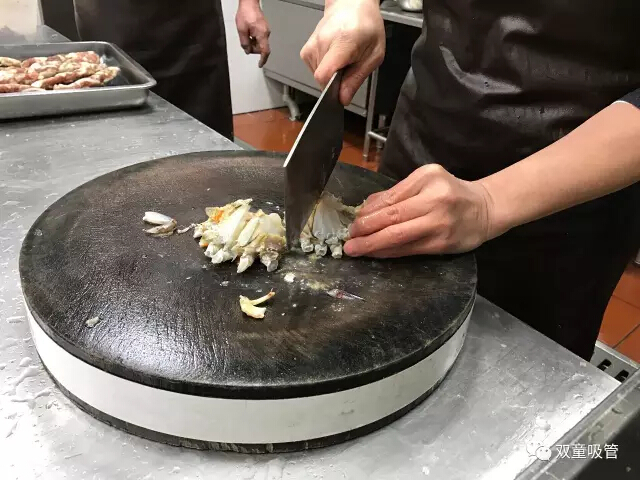 13、螃蟹宰殺完畢后放菜板將蟹腳去除,大腳砍成三段、小腳砍成兩段。