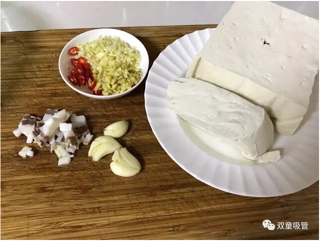 19、準(zhǔn)備適量火腿,準(zhǔn)備新鮮的鹽鹵嫩豆腐,一般一斤螃蟹配3斤左右豆腐,豆腐一定要新鮮水嫩。