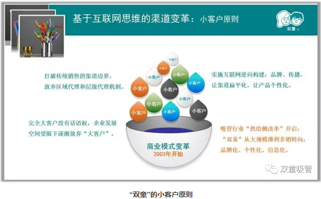 如今,在“雙童”的內(nèi)銷市場(chǎng)中,商超銷售占30%,個(gè)性化定制產(chǎn)品占30%,其余40%則是小客戶銷售。據(jù)統(tǒng)計(jì),“雙童”的小客戶總量已達(dá)到了12000多家,這些寶貴的客戶客觀上與“雙童”一直發(fā)生著動(dòng)態(tài)和靜態(tài)的貿(mào)易關(guān)系。有些靜態(tài)客戶可能一兩年才拿一次貨,一次拿幾箱產(chǎn)品。但在“雙童”看來,它們都是寶貴的客戶。正是因?yàn)橛唵晤~不大,對(duì)產(chǎn)品有個(gè)性化要求,反而造就了很高的品牌黏性——它們不至于因?yàn)檫@幾箱吸管而再去找其他企業(yè),從而形成巨大的長(zhǎng)尾效應(yīng),通過訂單的積累,長(zhǎng)期為企業(yè)創(chuàng)造著價(jià)值。