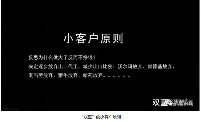 當(dāng)然,這并不意味著“雙童”要把所有大訂單都拒之門外,而是有選擇地接受一些有合理利潤(rùn)的長(zhǎng)期訂單。在“雙童”的生產(chǎn)線上,既可以生產(chǎn)出三五箱的訂單,也能生產(chǎn)出20個(gè)貨柜的大單。接單時(shí),不要只關(guān)注客戶的體量,一定要關(guān)注它能給企業(yè)帶來的增值。
