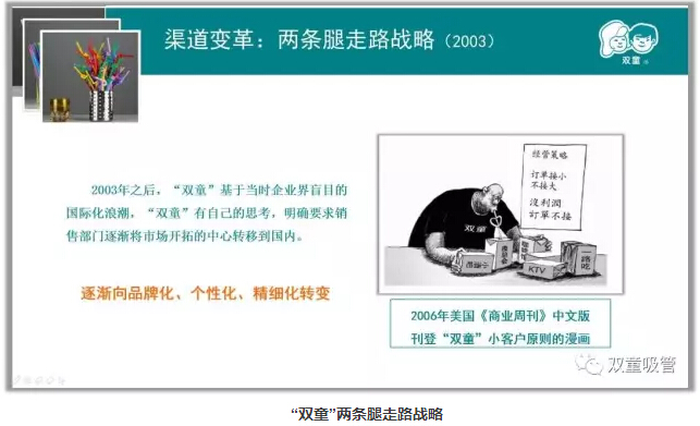 通過實(shí)施“小客戶原則”戰(zhàn)略,“雙童”在客戶數(shù)量提高的同時(shí)經(jīng)營(yíng)風(fēng)險(xiǎn)大大下降,從而掌握了企業(yè)的經(jīng)營(yíng)主動(dòng)權(quán),促進(jìn)了企業(yè)的研發(fā)創(chuàng)新能力,帶動(dòng)了“雙童”品牌的不斷提升!