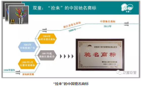 于是,樓仲平就拿著這個(gè)圖案去找義烏工商局咨詢,義烏工商局的科長(zhǎng)直接了當(dāng)?shù)馗嬖V他,這一定是已經(jīng)注冊(cè)過(guò)的商標(biāo)了!但樓仲平并不死心,花了三百塊錢(qián)查詢費(fèi)要求科長(zhǎng)在電腦上查一下,經(jīng)過(guò)查證之后發(fā)現(xiàn)這個(gè)商標(biāo)還真沒(méi)有人注冊(cè),于是,樓仲平立馬帶著相關(guān)證件,用了2000元搶占先機(jī),把這個(gè)圖案注冊(cè)為商標(biāo)。在確定商標(biāo)名稱時(shí),根據(jù)圖案上兩個(gè)兒童的標(biāo)志,樓仲平夫婦將“雙童”確定為商標(biāo)的名字。正是樓仲平的這次舉措,“撿來(lái)”了“雙童”的中國(guó)馳名商標(biāo),也邁出了企業(yè)的品牌建設(shè)發(fā)展最為關(guān)鍵的一步,改變企業(yè)命運(yùn)的同時(shí)也提升了整個(gè)行業(yè)的認(rèn)知!