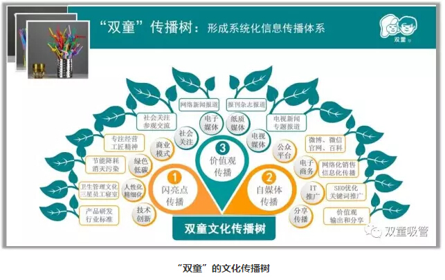 左邊是閃亮點(diǎn)的傳播介紹,包括了綠色制造、節(jié)能降耗、精細(xì)化管理以及技術(shù)創(chuàng)新等內(nèi)容。右邊通過(guò)微博、微信、博客、官網(wǎng)、百科等制造話題,即時(shí)發(fā)布博文、軟文、帖子等內(nèi)容,并進(jìn)行互聯(lián)網(wǎng)、IT推廣、展位推廣等自媒體的傳播。上邊則是政府、媒體關(guān)注的價(jià)值觀傳播。三大部分組成了“雙童”的文化傳播樹(shù)!