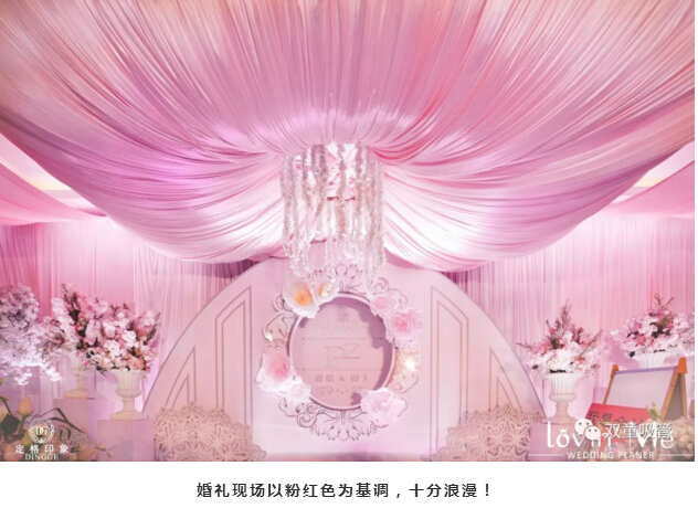 婚禮現(xiàn)場裝飾以粉紅色為基調(diào),非常浪漫。婚宴席開50桌,來賓們共同見證一對新人的幸福時刻!