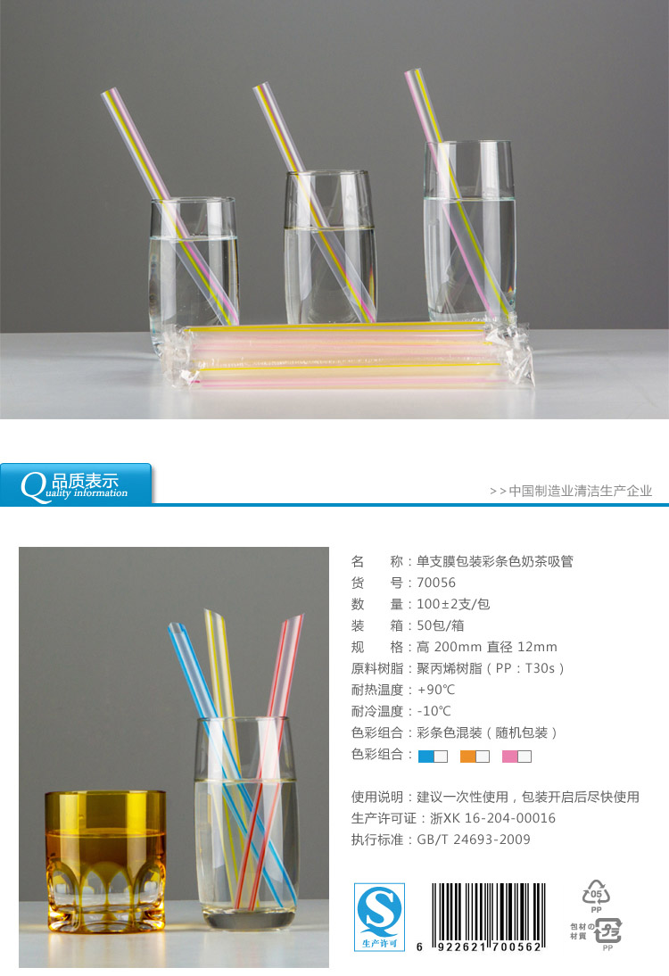 70056雙童100支單支膜包裝透明彩條色珍珠奶茶吸管